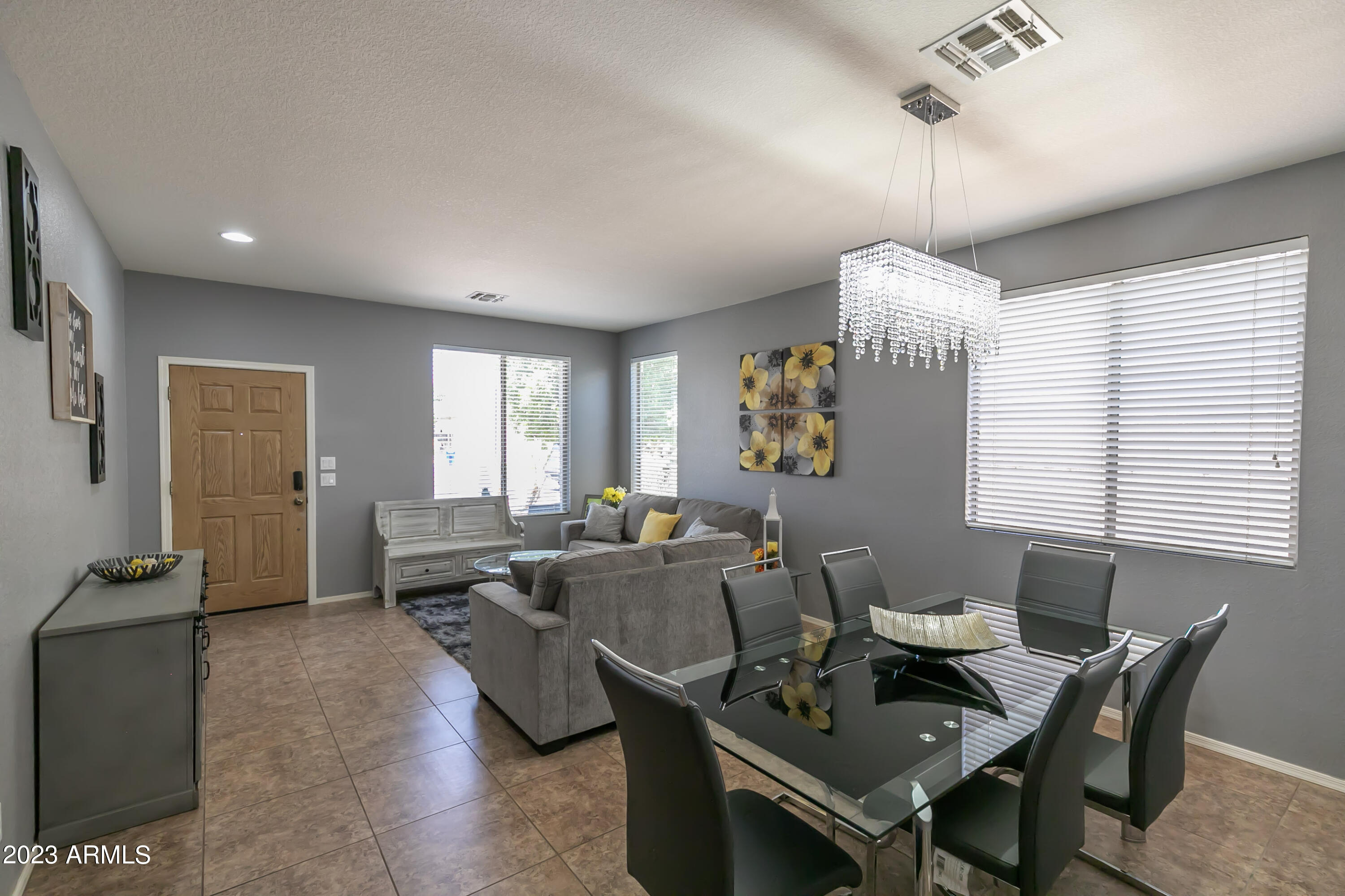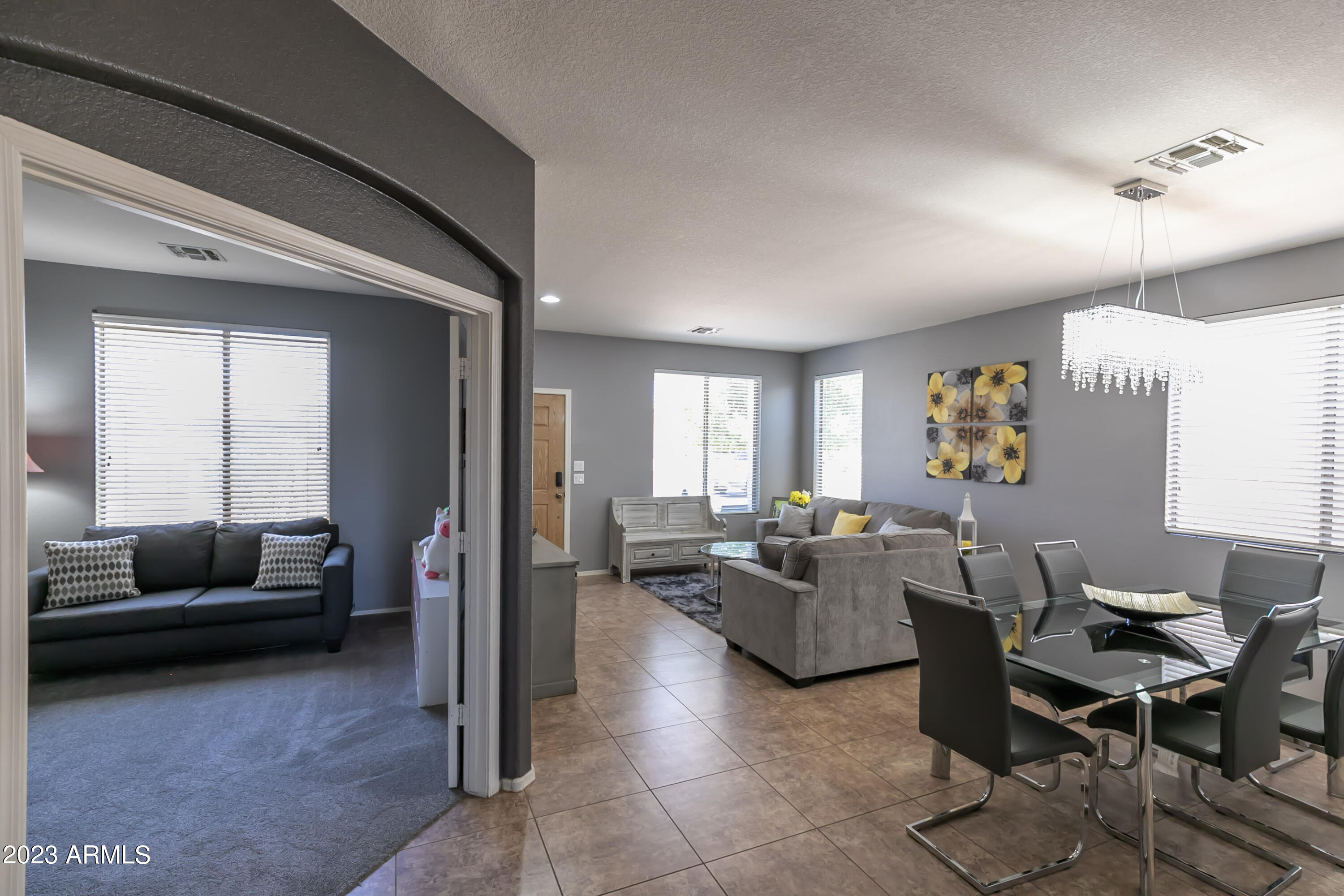 Be the first to see this stunning single-level 4 bedroom, 2 bathroom home backing to family park in the highly sought after Crimson Creek community! No neighbors behind & on a cul-de-sac. Vaulted ceilings & fans throughout. Flowing split floor plan, w/modern interior palette, tile & new carpet in bedrooms. North/south facing home features open kitchen with wrap around counters, upgrades & new farmhouse sink. Great room has gas fireplace & is perfect for all your entertaining needs! Primary bedroom has ensuite bath with double sinks, separate glass shower & tub with generous walk-in closet. Private exit from primary to backyard. Den/4th bedroom has double door & closet.Spacious backyard with a covered patio on oversized 8950 SF lot. Conveniently located near US 60, 202, shopping & dining