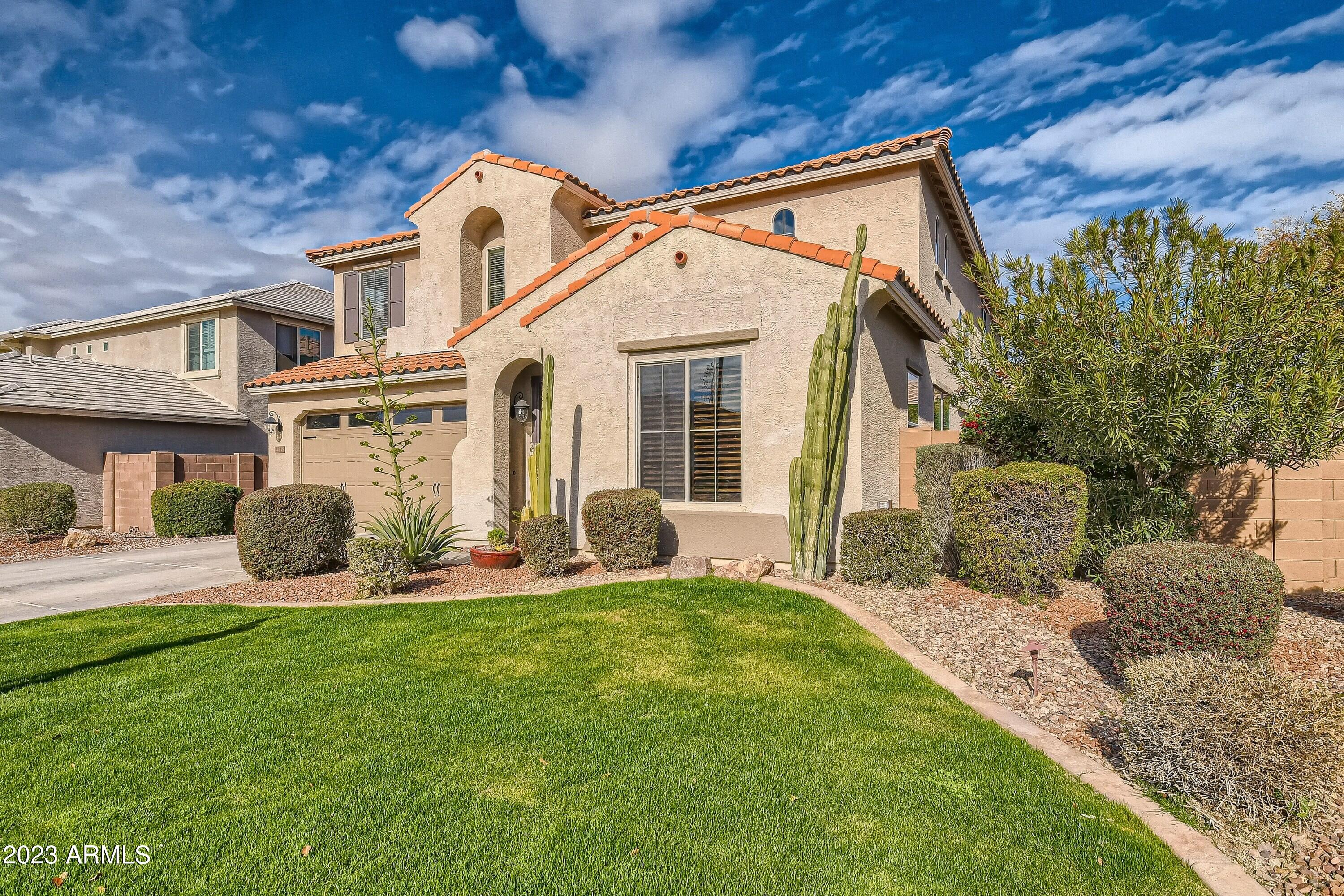 This former MODEL home,perfectly located within walking distance to the Elementary School and tons of community amenities, is 3548 sq.ft and features 5 bed (Master Downstairs), 3.5 bath, formal dining room, den, large loft, and a 3 car garage! Beautiful upgrades include: Beech cabinets throughout, stainless steel appliances with gas cooktop, 20 inch tile in all the right places, granite countertops in kitchen, tiled countertops and surround in master bathroom, plantation shutters, crown molding in master bedroom and secondary bedroom, jack-in jill bath upstairs, custom paint, cabinets in garage and workbench, sealed garage, and more! The backyard enjoys a grassy play area and firepit. The community of Adora Trails offers many amenities including heated pool, basketball courts, playground area, ramadas, fitness center and more! Conveniently located near restaurants, shopping, San Tan Village, 202 freeway and more! Don't miss out on this amazing home!